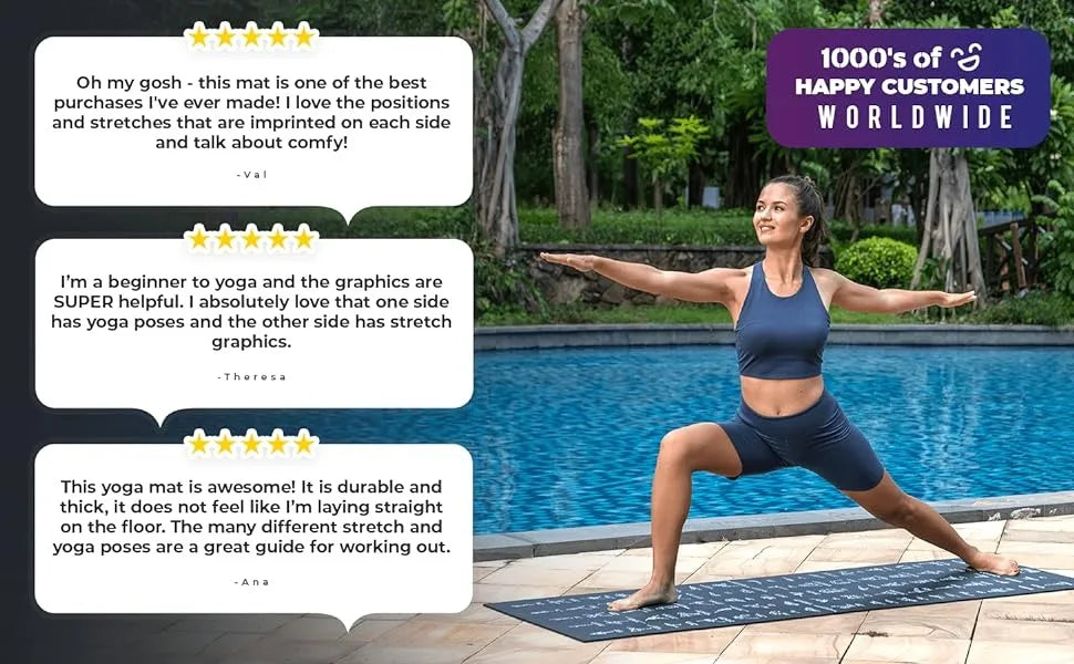 Instructional Yoga Mat with Poses Printed On It & Carrying Strap - 75 Illustrated Poses & 75 Stretches