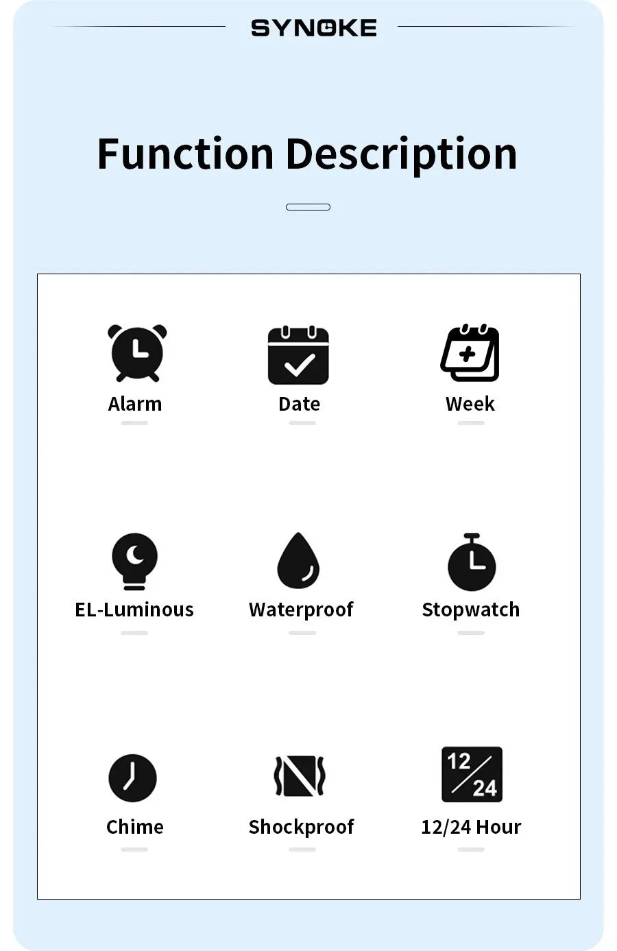 • LED Light Feature :The LED light feature of the Synoke watch allows for easy visibility in low light conditions, enhancing its practicality for outdoor use.