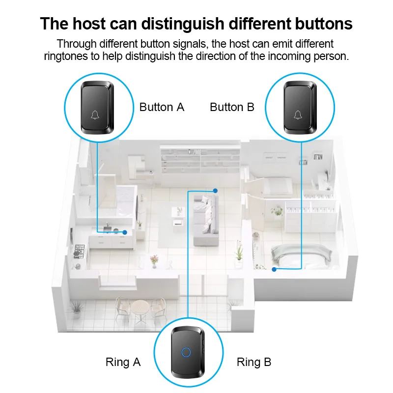 6) Supports the use of multiple sets of doorbells, Press any button, the receiver ringtone will sound, and each button can be set with a different ringtone to distinguish visitors.
